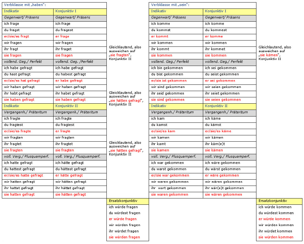 Singular oder Plural zum Einsatz. Die folgende Liste der Konjunktivformen zeigt, warum viele Konkunktive als geänderte Zeitformen erscheinen. Grundsatz: Der Konjunktiv muss